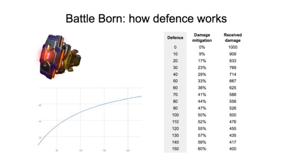 ※1 Battle Born (バトル・ボーン)の、「防御力(Defence)」と「ダメージ軽減(Damage mitigation)」「被ダメージ(Received damage)」との関係について