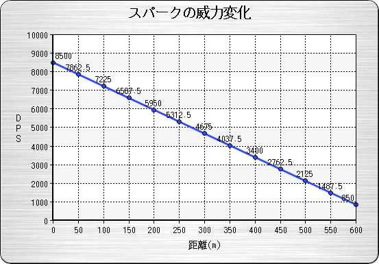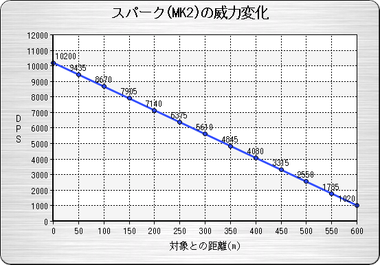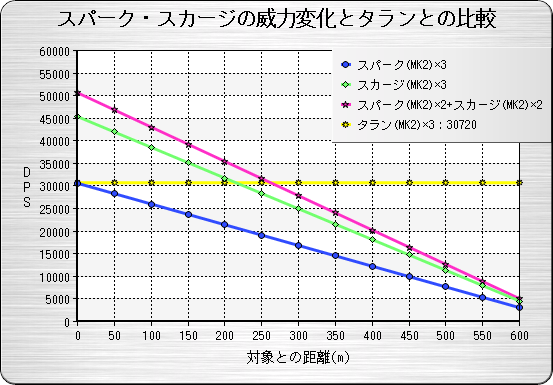 【図2】~【図4】までは、距離によるダメージ量の変化を、搭載可能な機体を具体的に想定して表したものです。【図2】の「Spark(スパーク):MK2×3」は、Pursuer(パーサー)及びGepard(ゲパルト)を想定しています。【図3】「Scourge(スカージ):MK2×3」は、Haechi(ヘチ)及びBulgasari(プルガサリ)、【図4】の「Spark(スパーク):MK2×2+Scourge(スカージ):MK2×2」はGriffin(グリフィン)及びRaven(レイヴン)及びRhino(ライノ)を想定しました。この点、Spectre(スペクター)は、Scourge(スカージ):MK2を3つから4つに変えるだけなので割愛しました。 br「【図2】のSpark(スパーク):MK2×3 」<「【図3】Scourge(スカージ):MK2×3 」<「【図4】のSpark(スパーク):MK2×2+Scourge(スカージ):MK2×2」と、同距離において後者ほど威力が上昇します。「中武器×3」よりも「中武器×2+軽武器×2」の方が威力が高い原則はここでも当てはまります。 brbrbr【図5】は、上記をまとめたものに「Taran(タラン):MK2×3」(30720)を加えて比較したものです。なお、「Taran(タラン)×2+Magnum(マグナム)×2」(30272)はDPSがTaran(タラン)×3の場合とほぼ同じなので割愛しました。この点、Taran(タラン)とMagnum(マグナム)の組み合わせでは、DPSが非常に低い(DPMは非常に高い)Magnum(マグナム)の性質のため、「中武器×3」よりも「中武器×2+軽武器×2」の方が威力が高い原則は当てはまりません(むしろ中武器×3の方がわずかに高い)。 br【図5】を見ると現実的ではないものの、「Spark(スパーク):MK2×3」でも0距離まで近づけば「Taran(タラン):MK2×3」(30720)の威力に迫れることになります。また、「Scourge(スカージ):MK2×3」の場合は、215m付近で「Taran(タラン):MK2×3」(30720)の威力に並びます。「Spark(スパーク):MK2×2+Scourge(スカージ):MK2×2」の場合は、262m付近で「Taran(タラン):MK2×3」(30720)の威力に並びます。 br【図5】 refbr |