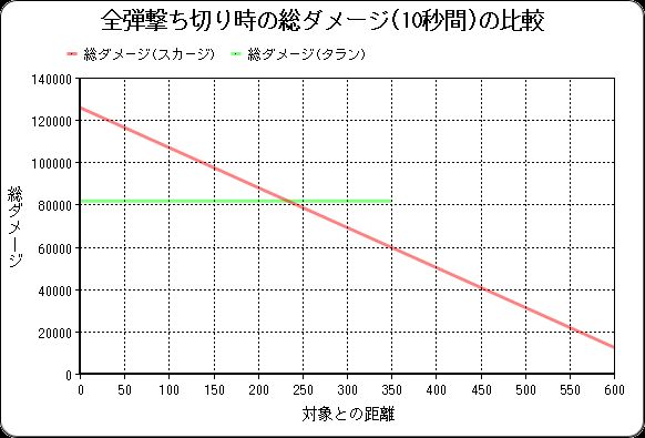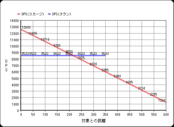 Taran(タラン)の威力を超える分岐点となる距離がDPSの場合:約215m→総ダメージの場合:約233mに変わるだけである。