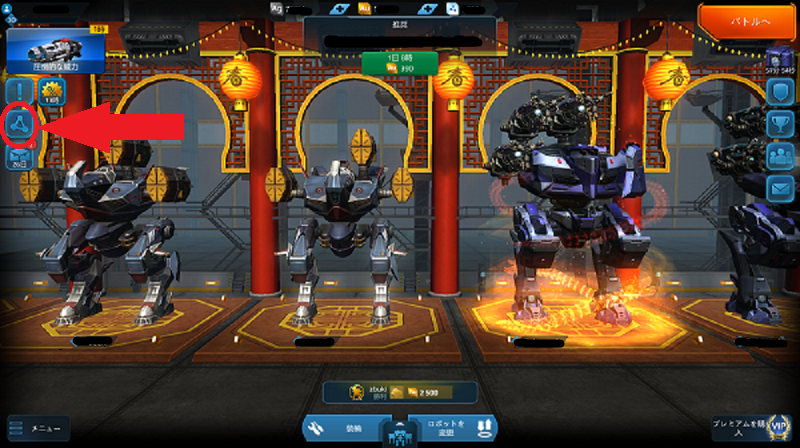 格納庫画面の左端、デイリーミッションの下にトライフォースみたいな図形が表示されているボタンを押すと、ワークショップを開くことができる。