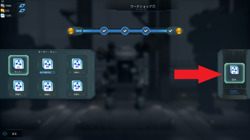 ワークショップでは、緑色になっている枠を押すと、40000agを支払うことで一枠につき85WPを4時間に一度(1日当たりトータルで510WP)手に入れることができる。